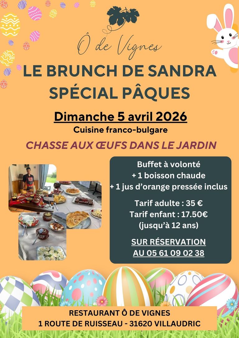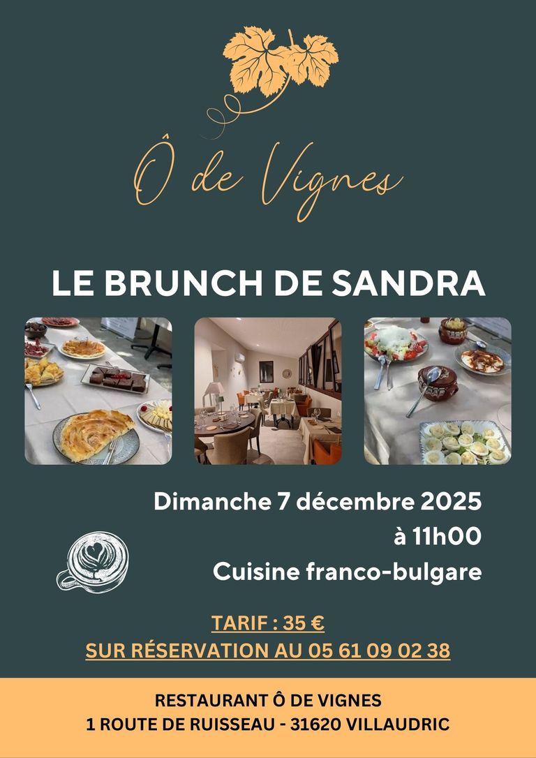 Le 1er dimanche de chaque mois à 11h00, Sandra propose un brunch. Tantôt 100% français, tantôt franco-bulgare mais toujours gourmand ! Ce brunch favorise les produits locaux, les fruits et légumes de saison provenant de petits producteurs et éleveurs du nord toulousain, comme le chèvre frais, les pommes, les oeufs bio et le pain du boulanger. Rappelons que Sandra s'est classée 3e au concours des meilleurs petits déjeuners de France en 2019. Elle a également décroché le prix de la recette originale avec la "Bubble" tartine en 2021 : chèvre frais aux pistaches, façonné en demi-bulle et accompagné de purée de potimarron sucrée et de magret de canard séché.